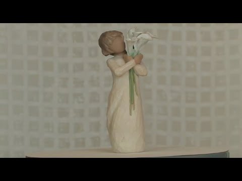 - Standing figure in cream dress, holding tall bouquet of white calla lilies