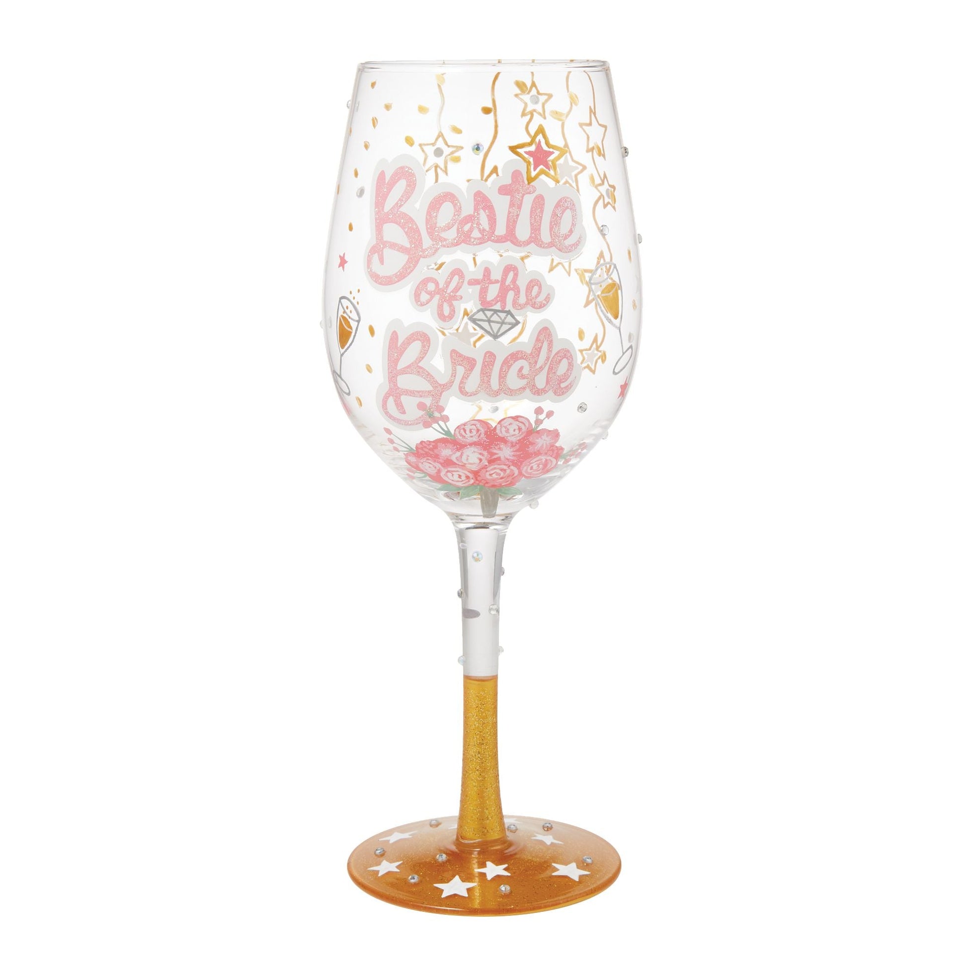 Celebrate everlasting friendship with this lovingly hand-painted wine glass from Lolita designed for any of the brides besties. Adorned with sparkling glitter, stars, and beautiful flowers, it honors cherished besties of the bride now and forever.