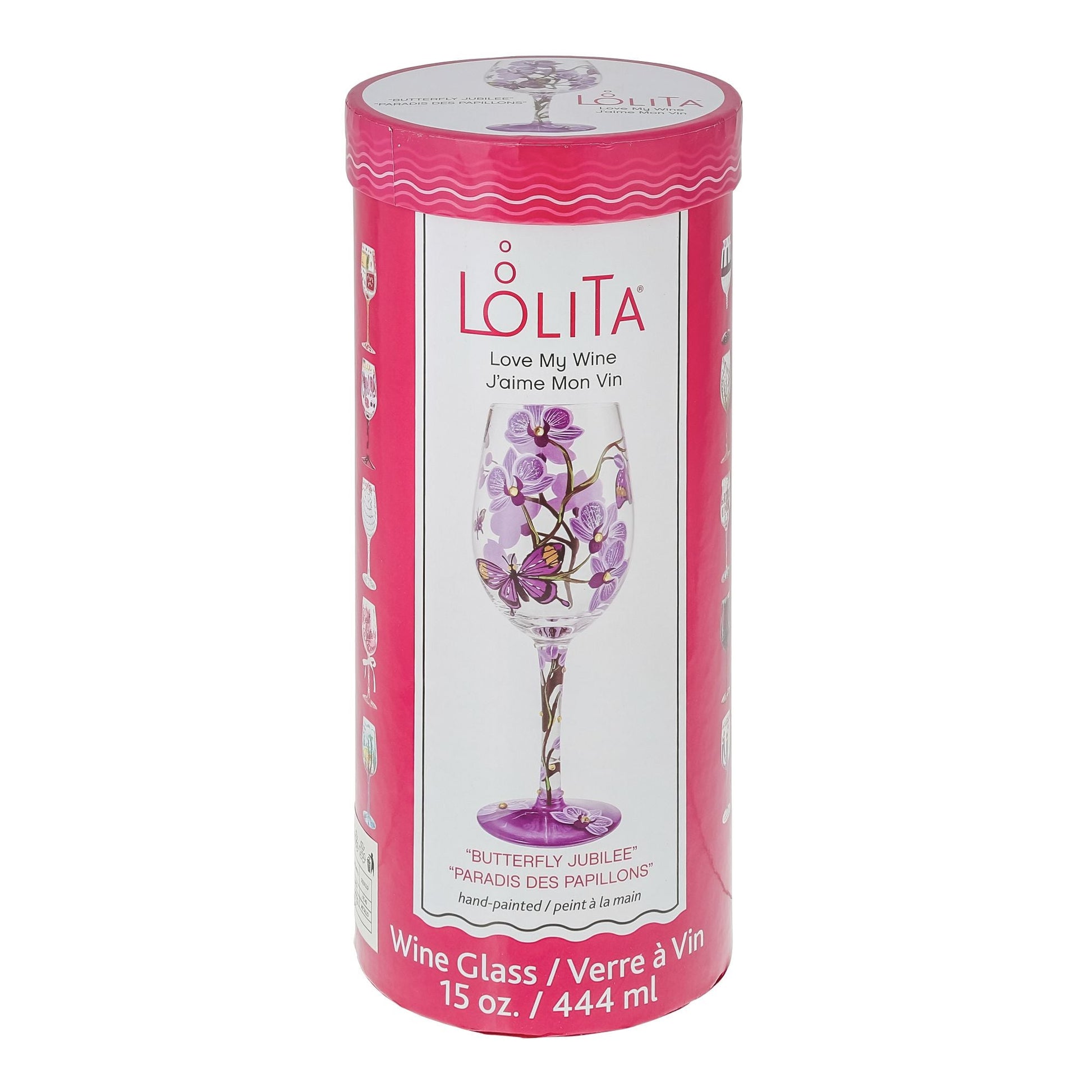 This wine glass by Lolita is a picturesque purple landscape. Gorgeous purple and gold winged butterflies play among sparkling orchids and bedazzled crystals. Perching on petals, these winged beauties encourage wonder and tranquility.