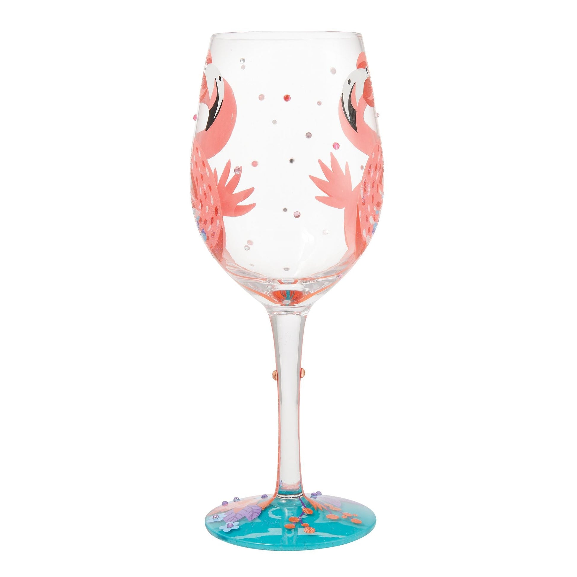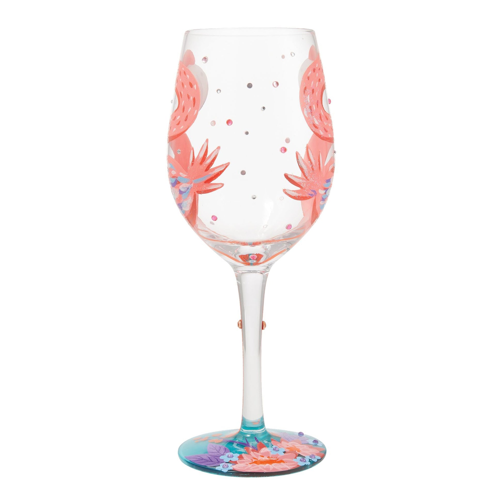 Indulge in the funky elegance of Lolita Designs with this playful wine glass, showcasing two pink flamingos standing on a base of colorful flowers. The cup sparkles with brilliant gems, adding a touch of intrigue to every sip. Make today fabulous!