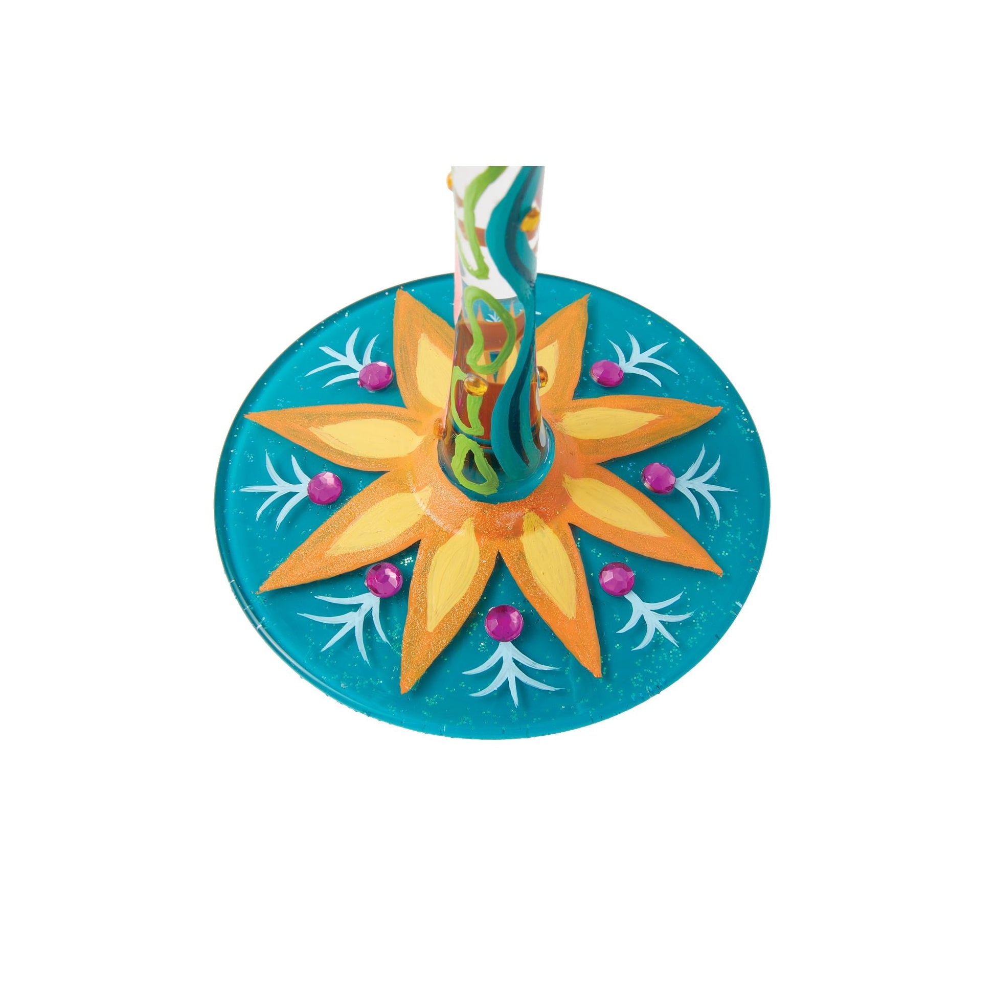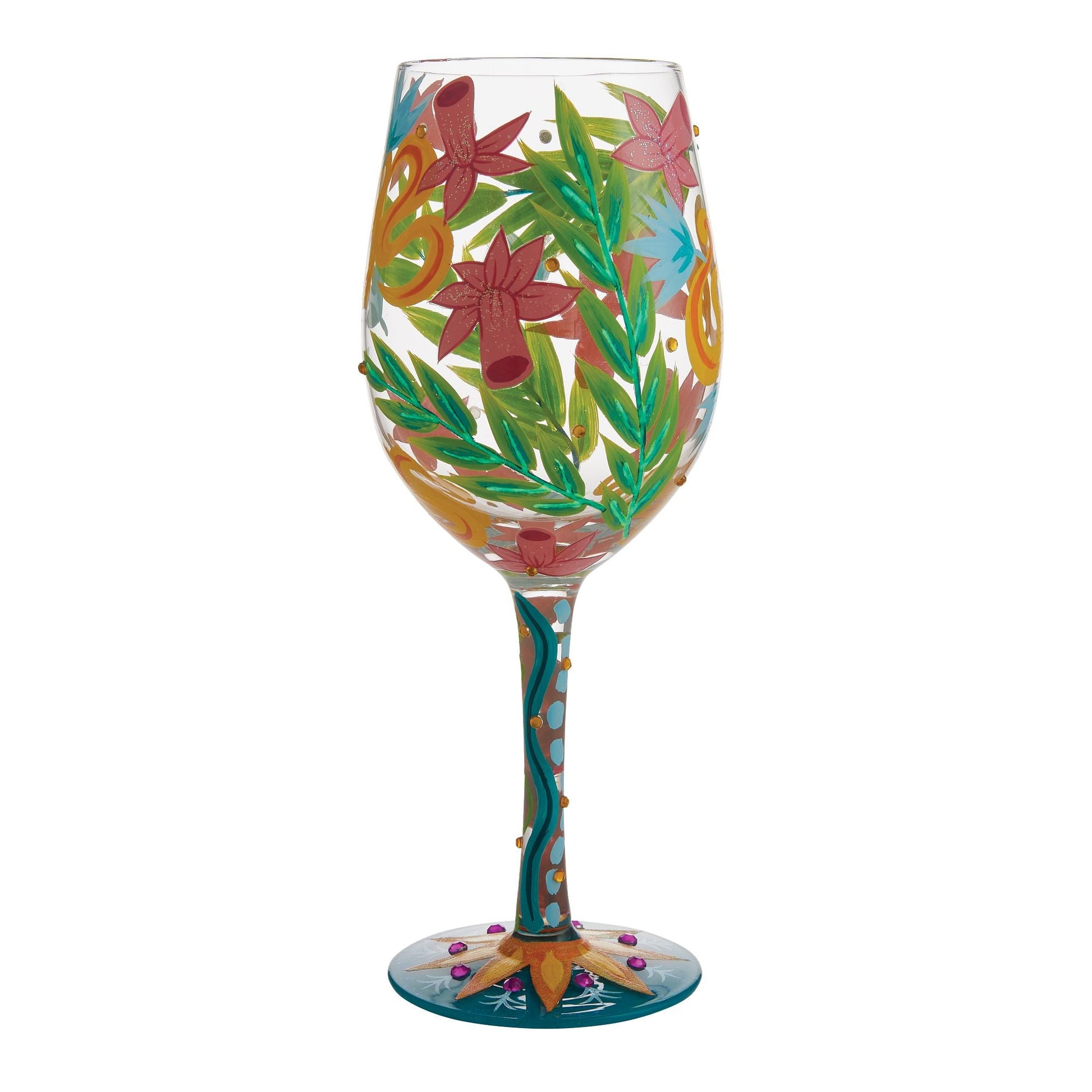 This vibrant glass from Lolita Designs adds exotic flair to any evening. With tropical flowers and leaves, the hand-painted wine glass delights with wild colors and spirited sparkle! Enjoy a little cup of paradise wherever you are.