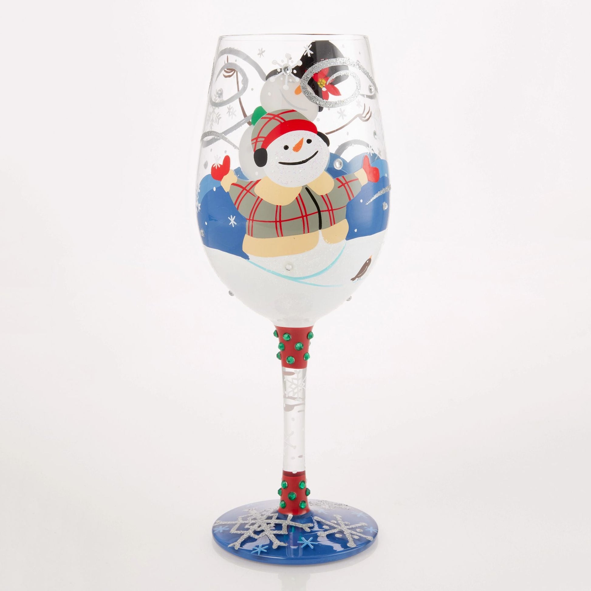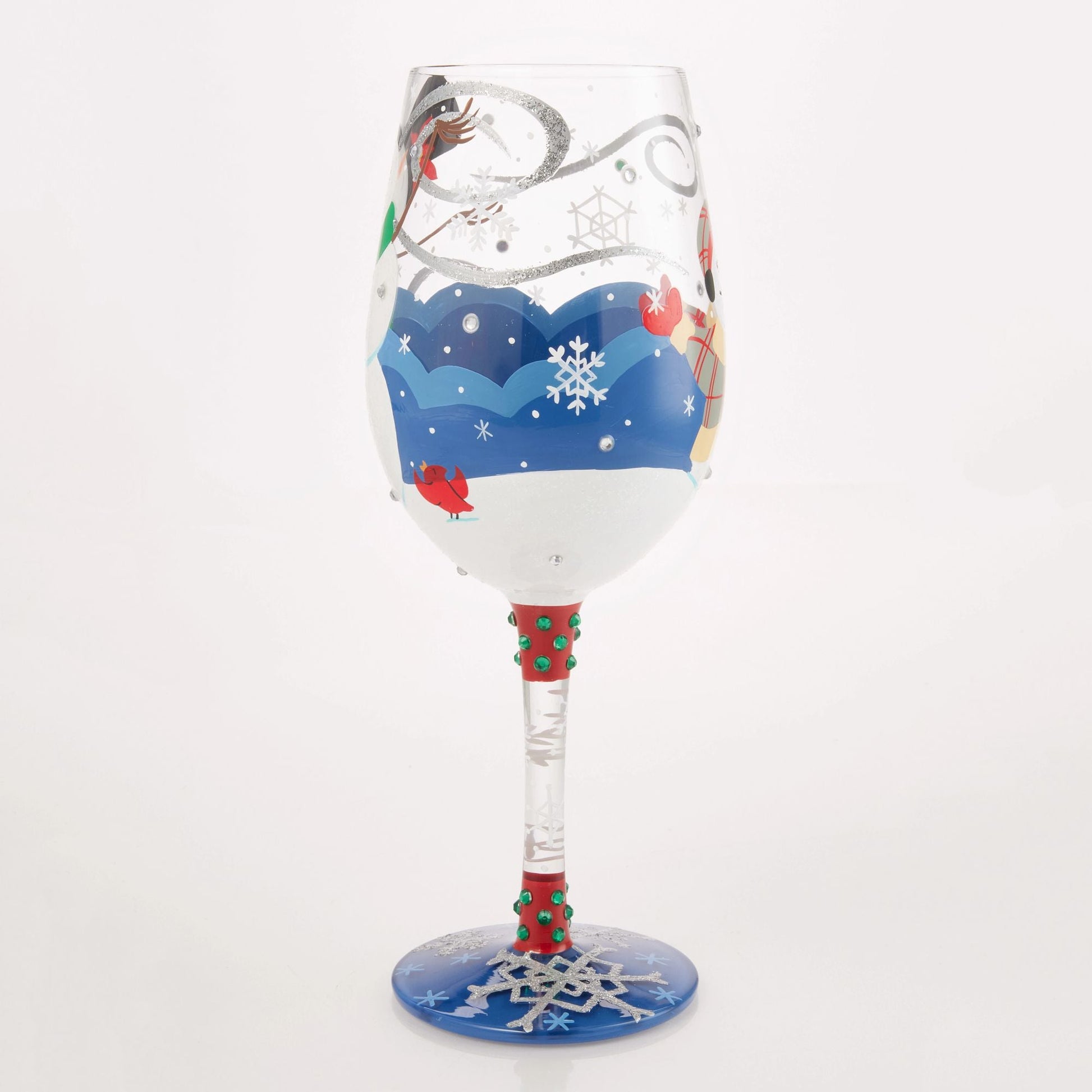 Embrace the season with this heartwarming Lolita wine glass, featuring cheerful snowmen bundled in cozy coats and scarves, smiling as they welcome the first snowfall. Their outstretched hands celebrate the magic of winter and the joy of the holidays!- First Christmas Snow from Designs by Lolita