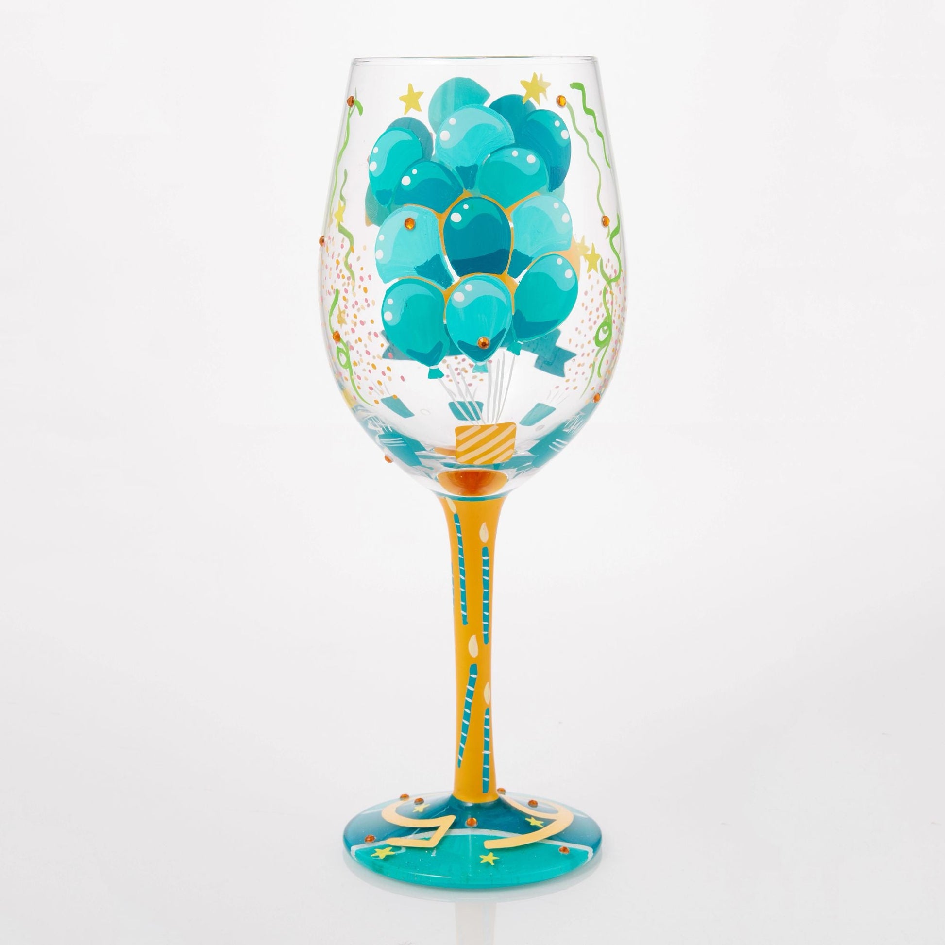 Celebrate a fabulous 65th birthday with this festive Lolita wine glass adorned with vibrant streamers, balloons, and stars in blues, yellows, and golds. There's a special drink recipe on the bottom of the base, making this glass perfect for toasts!- Happy 65th Birthday from Designs by Lolita