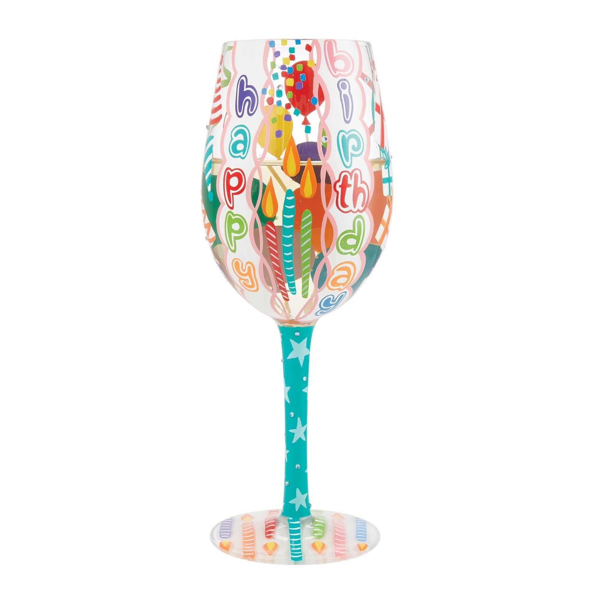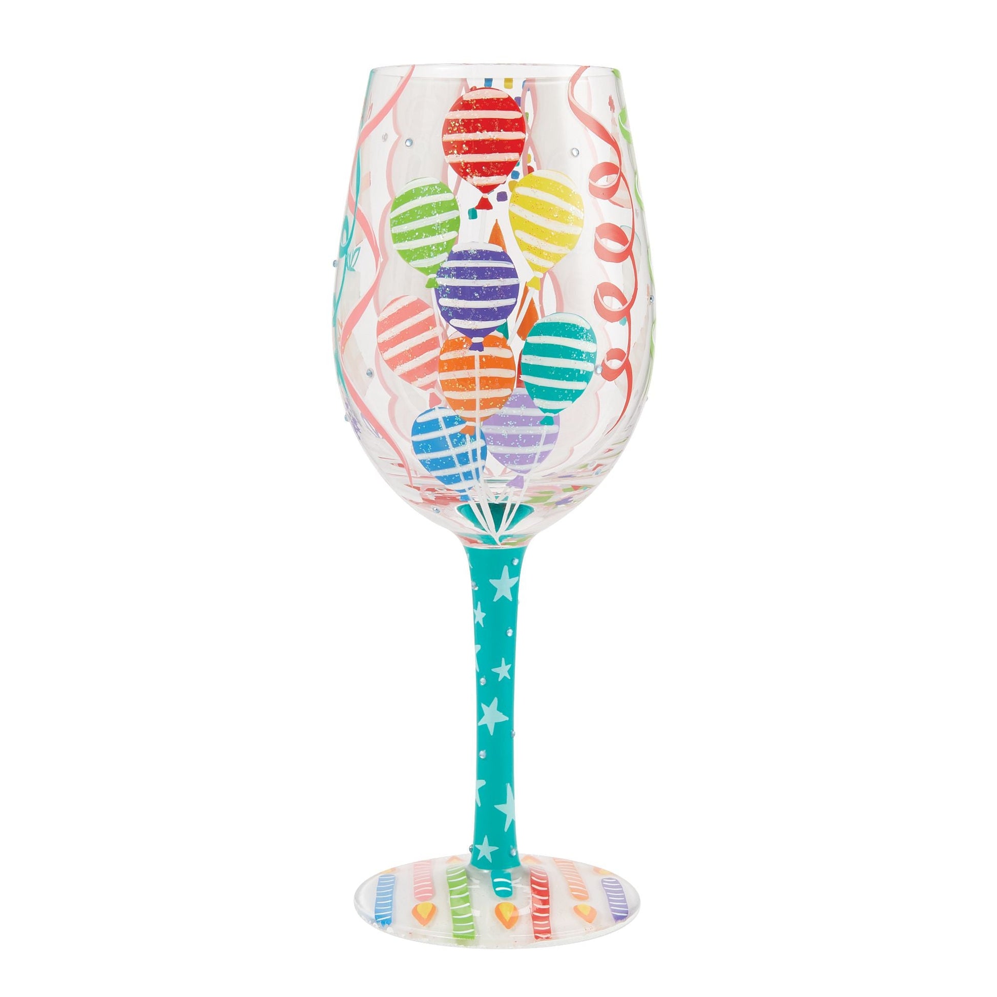 This colorful glass by Lolita brings the party to your table. With hand painted birthday balloons, candles, and presents, this festive wine glass celebrates you. The glass is 20 oz of fun and features bedazzled sparkles and an original drink recipe.