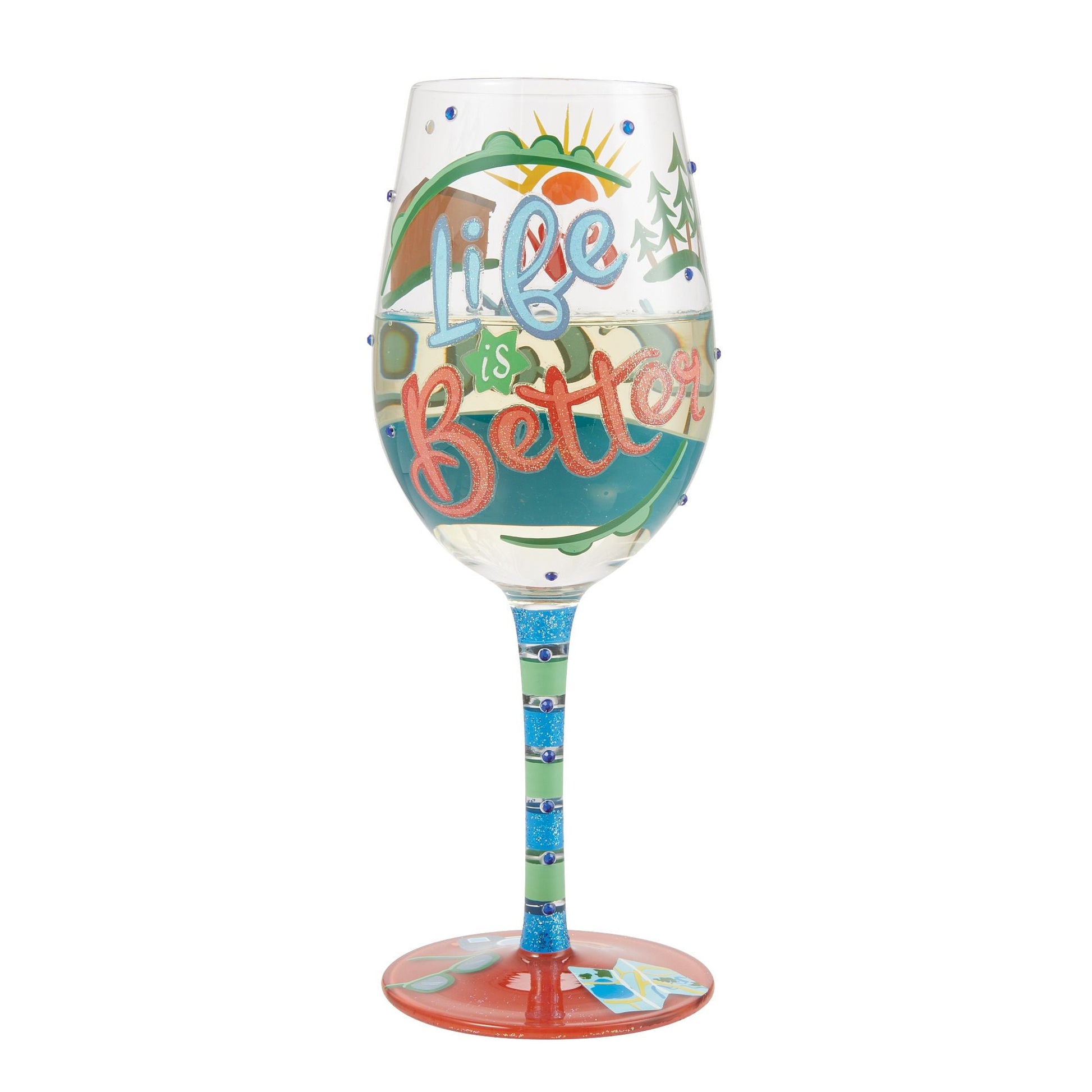 This colorful cup tells universal truths with style and sparkles. A hand-painted log cabin, map, and sunglasses, remind us life is better on vacation! With inlaid crystal details, trees, and sunshine, this glass beckons lakeside relaxation.
