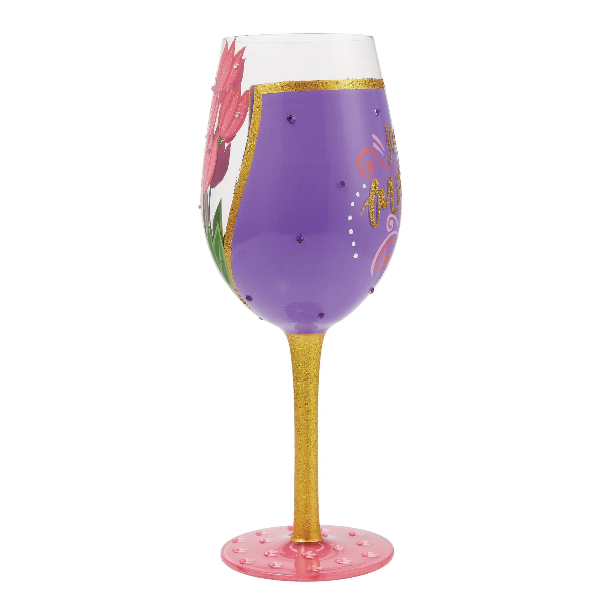 Give mom a gift she will cherish forever with this colorful wine glass from Lolita. Adorned with pink, purple, and gold and a heartfelt "Happy Mother's Day" in elegant script, this stunning glass gifts a hand-painted bouquet of sparkling pink tulips.