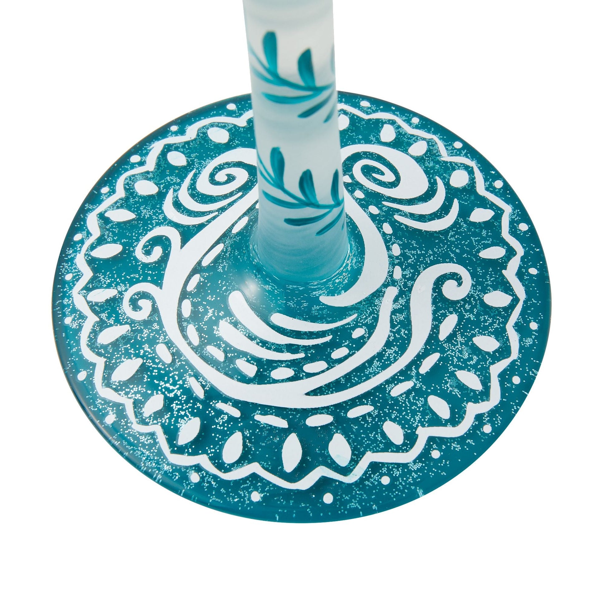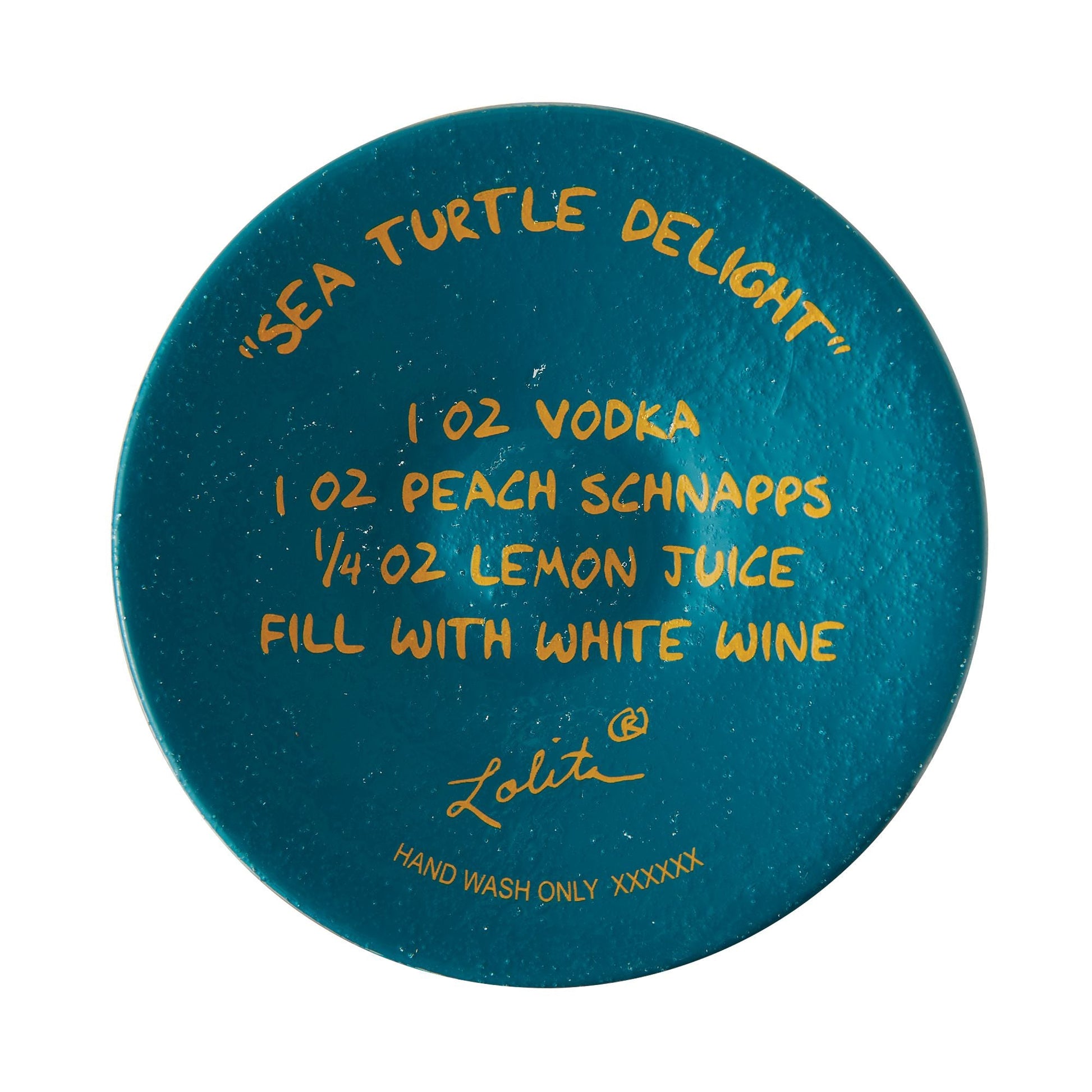 Dive into the enchanting sea depths with this colorful Lolita Designs wine glass, where seaweed, starfish, and ocean currents swirl in captivating hues. Encircling the cup, a band of pink, orange, and teal sea turtles add whimsy to your wine time.