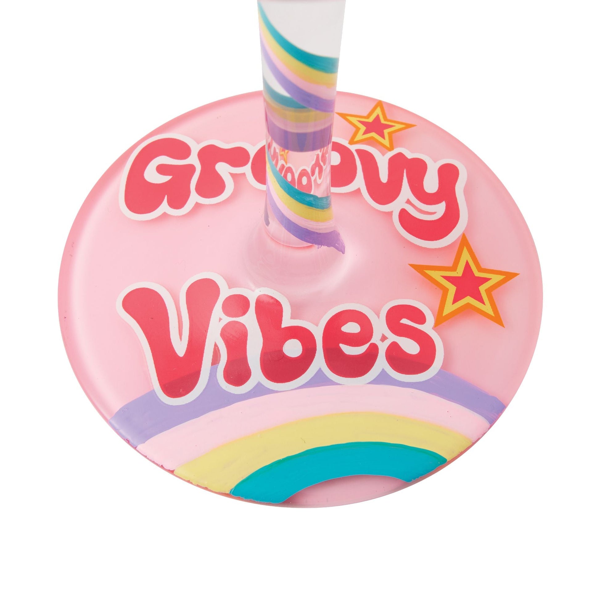 Celebrate Barbie, the original fashionista, with this vibrant Lolita glass, featuring her iconic pink logo, stars, and a colorful silhouette. The playful "Groovy Vibes" message adds an extra touch of fun to toasts made to Barbie's iconic style.- The Original Fashionista from Designs by Lolita