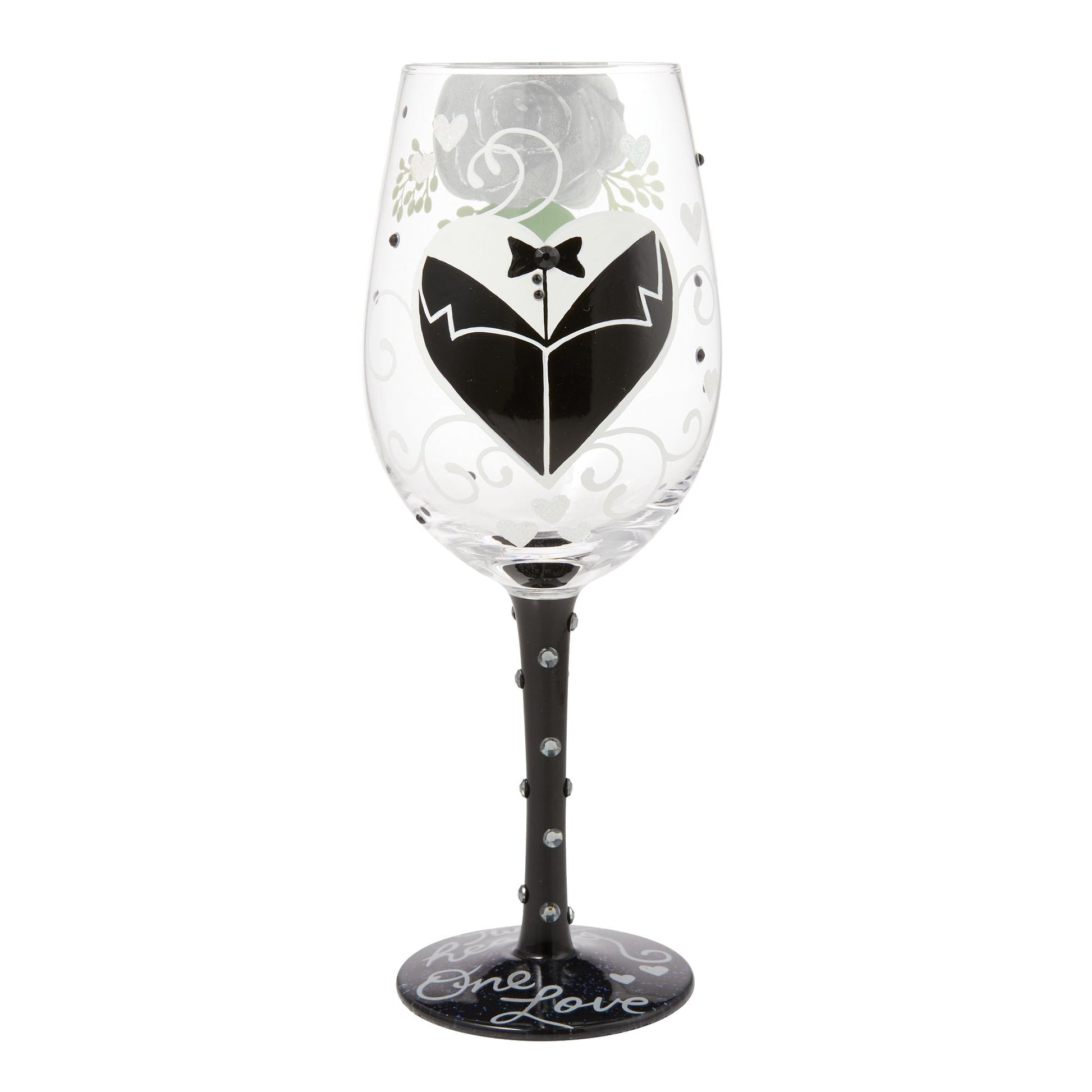 Celebrate everlasting love with this romantic hand-painted wine glass from Lolita, inspired by the dashing groom. Adorned with charming white hearts, swirls, and a sophisticated tuxedo with a bow tie, this glass is a perfect for cheers to forever!