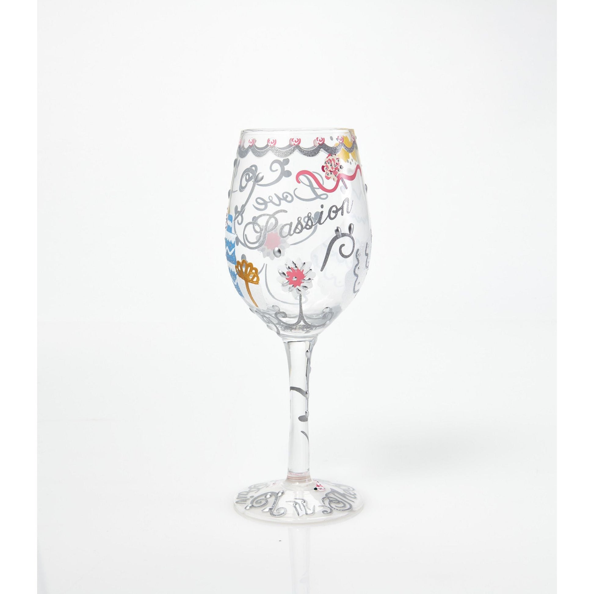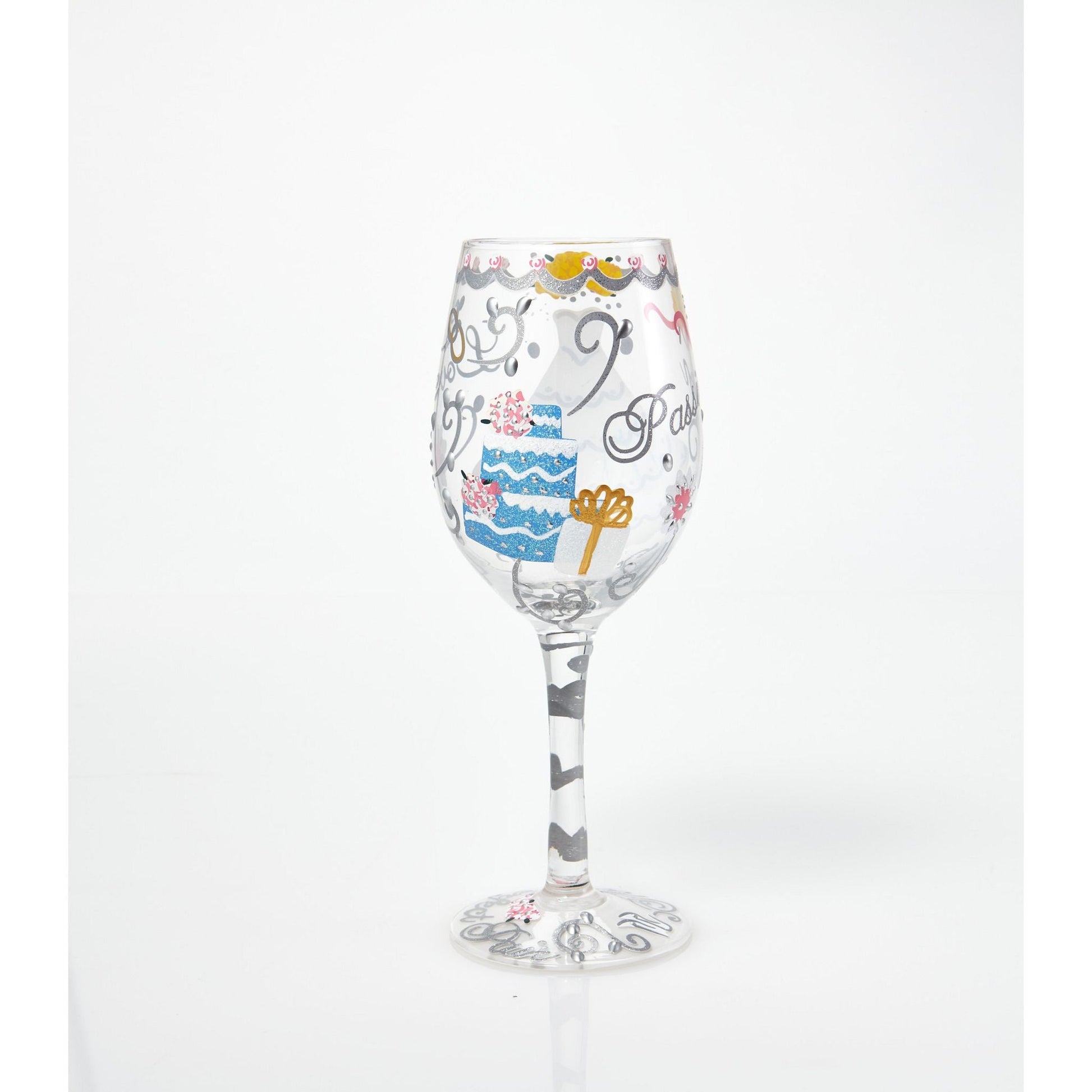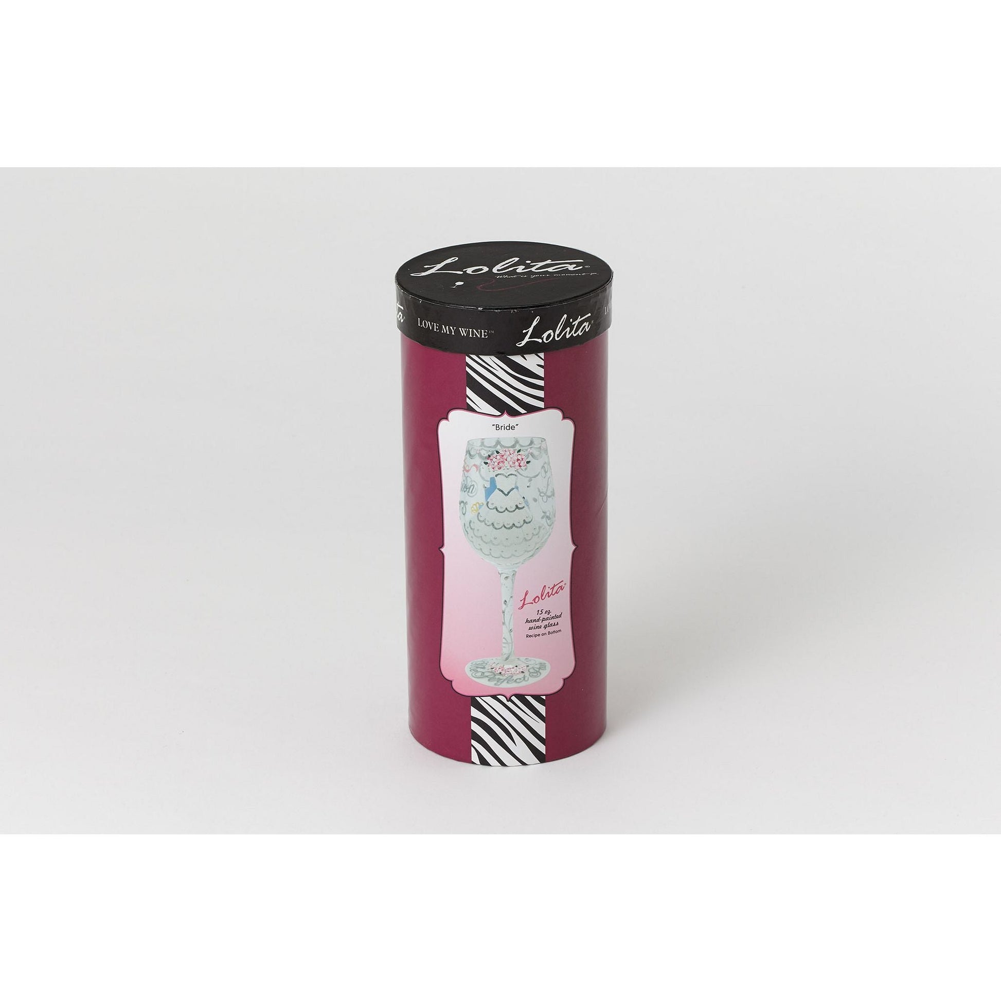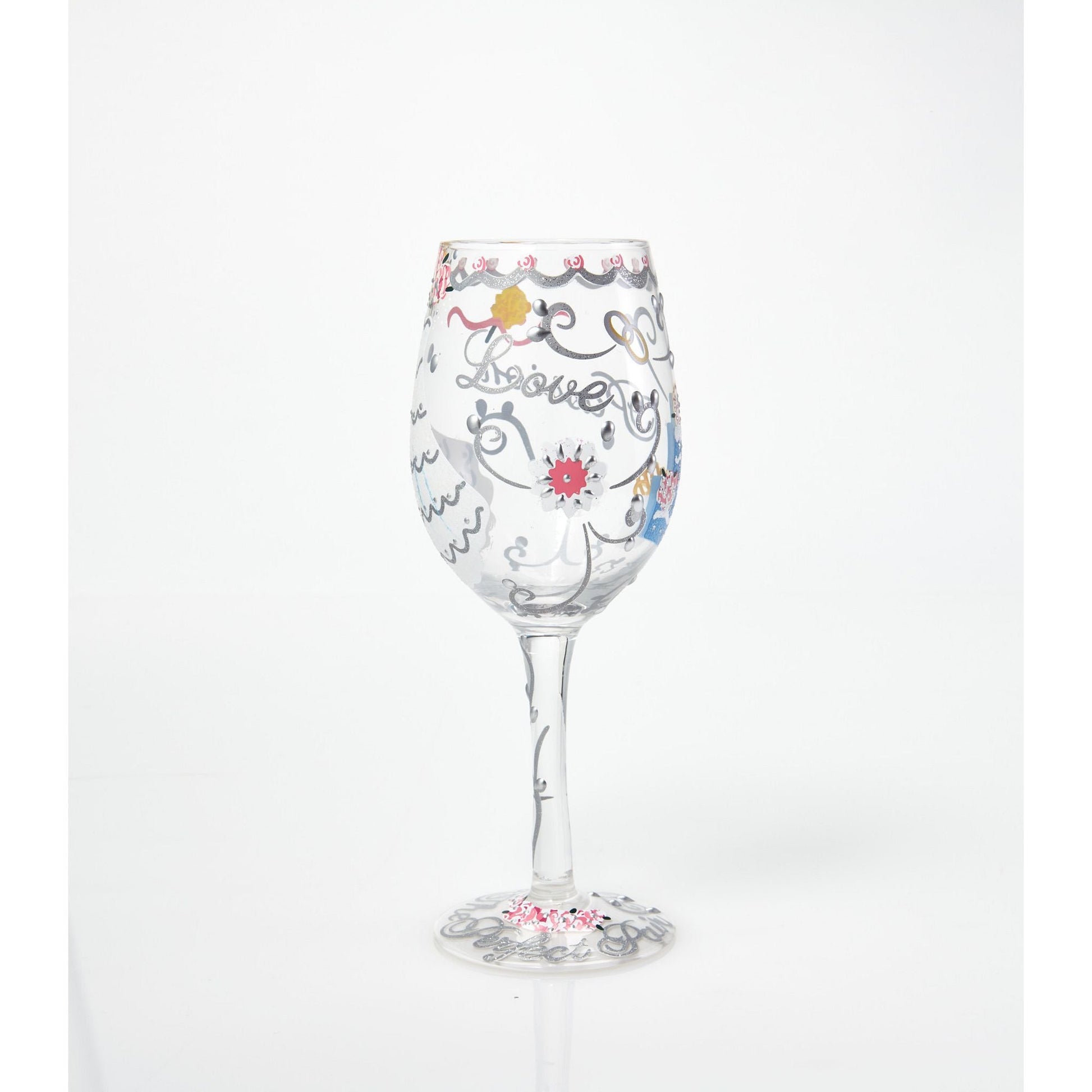 This chic 15 oz wine glass celebrates the love and passion that brings a one-of-a-kind bride to her special day. Arrives in a beautiful gift box with a unique cocktail recipe painted under the base of the glass. Made from blown glass. Hand Wash