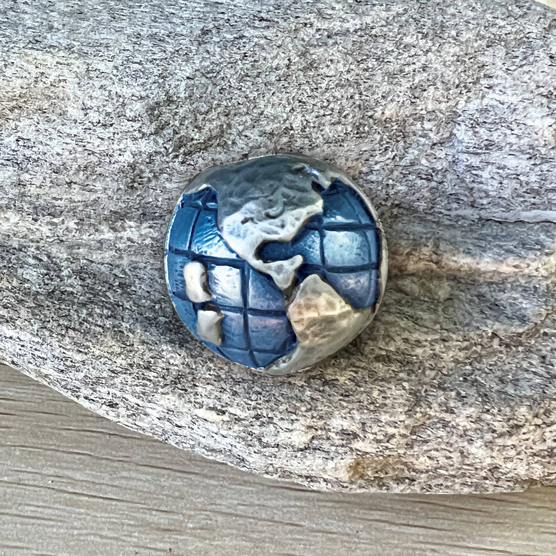 Solid metal spherical pocket token in silver enamel finish with blue epoxy accents. ¾” diameter. Poly bagged.